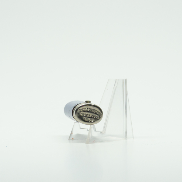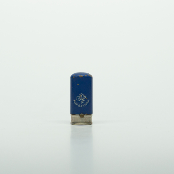 A small, flat, round lipstick tube. The aluminum tube has a blue enamel lid with text reading, "Park and Tilford," under a floral design. The bottom of the tube is stamped with text reading, "Park and Tilford / Distributor N.Y.C."