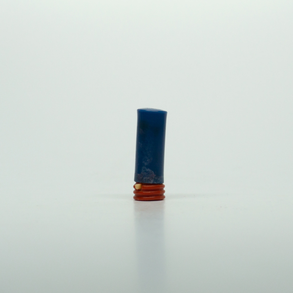 A blue and red plastic lipstick tube. The lipstick can be accessed by removing the lid and sliding up the outer button. The bottom of the tube is stamped with a shade label reading, "Orchid."