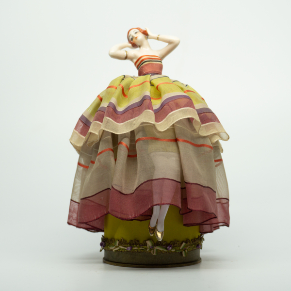 A flapper wearing makeup dressed in costume holding a fan while seated on a cushion. The figure can be lifted from the cushion to access the inside of the jar.