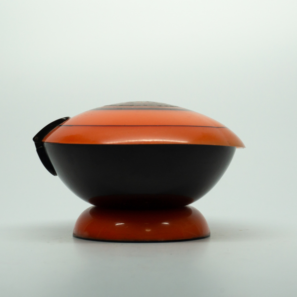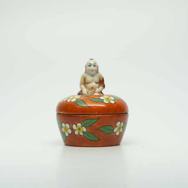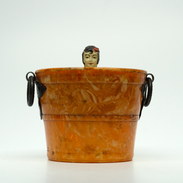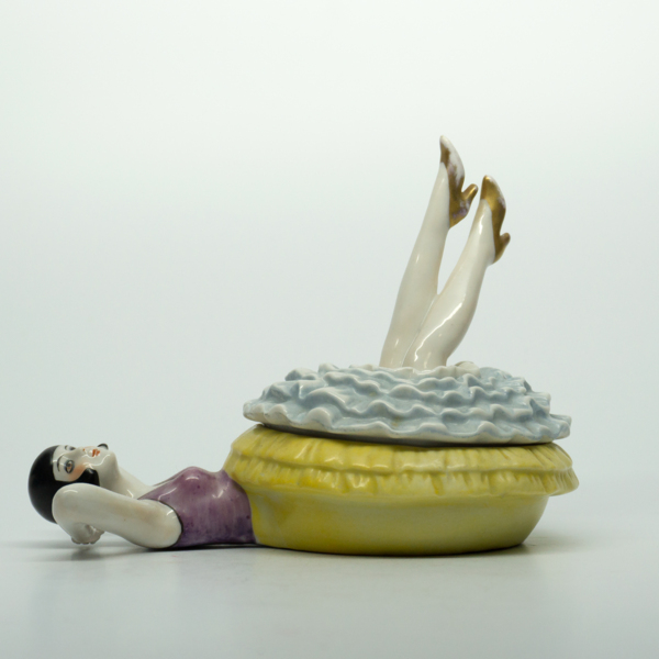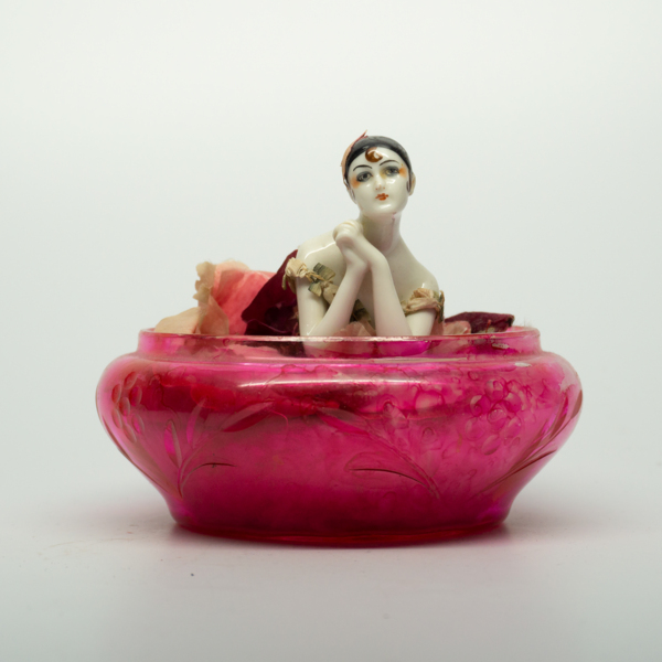A reclining feminine figure wearing makeup dressed in costume inside of a jar. The bottom half of the figure is a puff that can be lifted from the base that acts as a powder well.