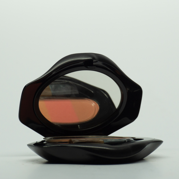 A black plastic lip-shaped blush compact. The compact opens on a hinge with a finger ridge. Inside, there is mirror, brush and three pressed powder blushes. A shade label on the bottom reads, "Parfums Salvador Dali Paris Copyright Ray Int. / 01 /…