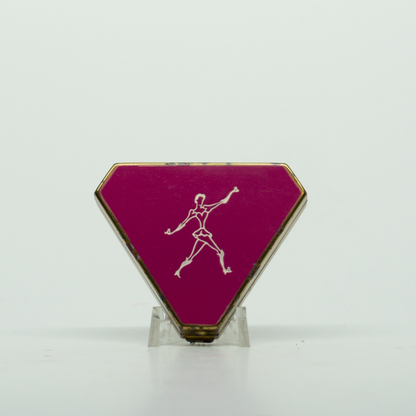 A triangular brass compact with a pink enamel top and a figure at its center. The compact opens on a hinge with a finger ridge. Inside there is a mirror, and heart shaped puff printed, "Schiaparelli." The bottom is engraved with a geometric texture.