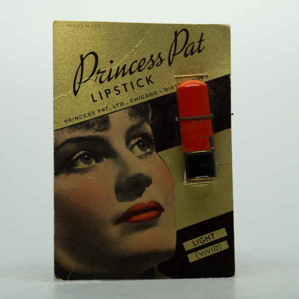A brass lipstick tube that can be opened by removing the top from its base. A lever on its side moves the product up and down. The bottom is stamped, "Princess Pat Ltd. Chicago Distribution."