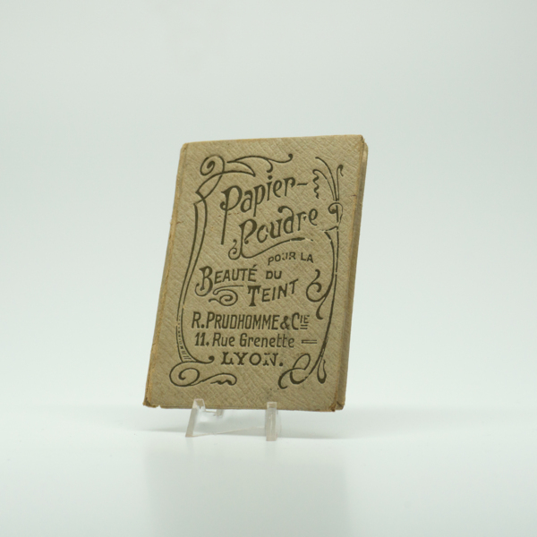 A rectangular cardboard container with embossed text written in French, "Papier-Poudre / Pour la Beaute Du Teint / R. Prudhomme & Cie. / 11. Rue Grenette Lyon."
