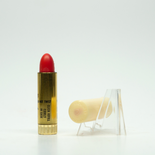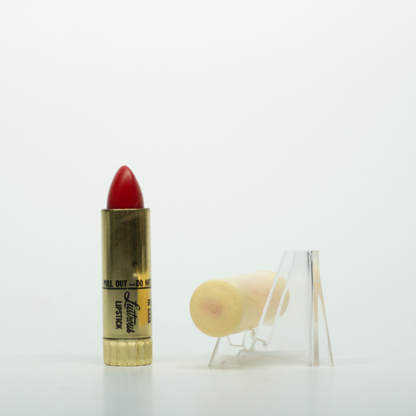 A brass lipstick tube with a plastic cap. The lipstick can be accessed by removing the lid and twisting the tube. The bottom of the tube has a scalloped edge and a shade label reading, "Lanolite -B- / Revlon N.Y. / 'Fifth Avenue Red' / Non-Smear Type…