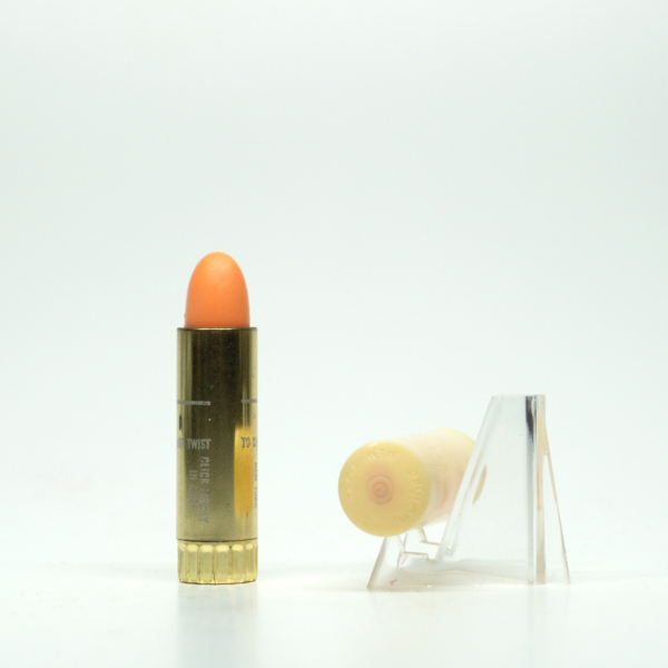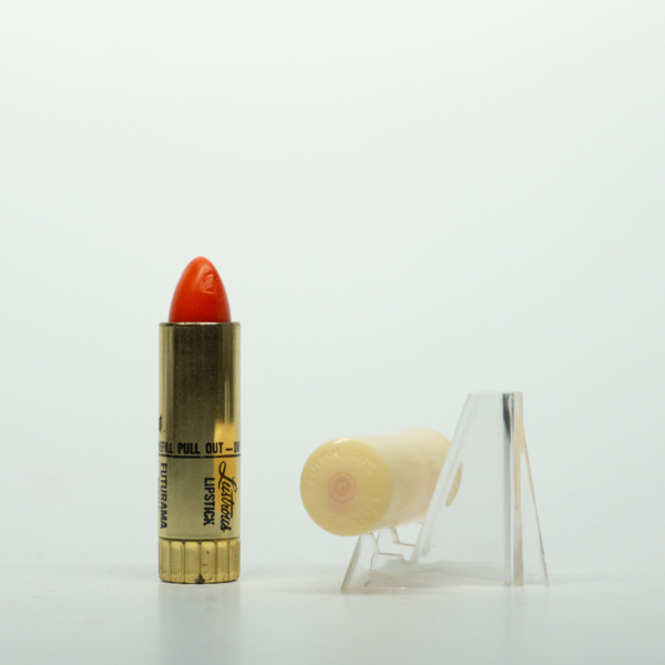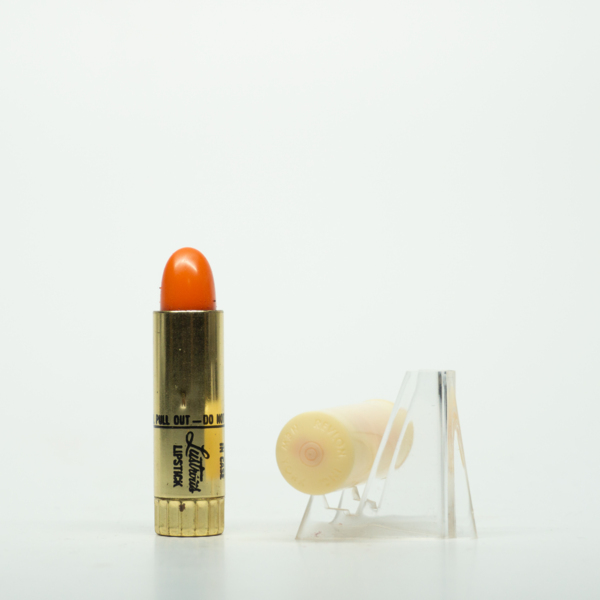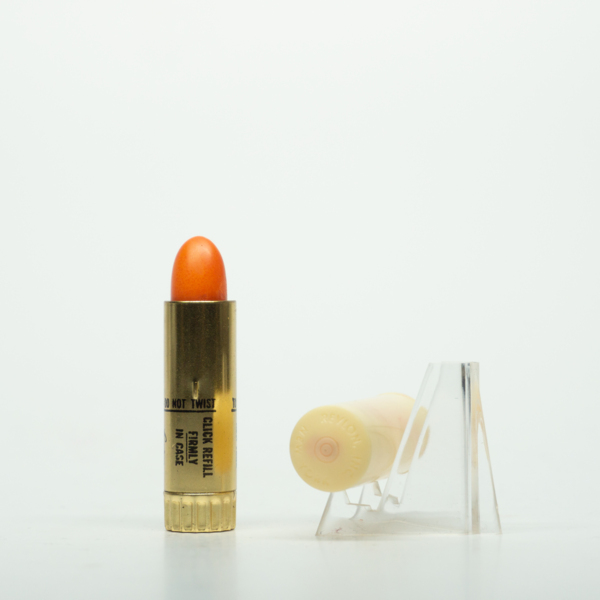A brass lipstick tube with a plastic cap. The lipstick can be accessed by removing the lid and twisting the tube. The bottom of the tube has a scalloped edge and a shade label reading, "Lustrous / Regular Type / 'Orange Float' / Revlon N.Y. / J…