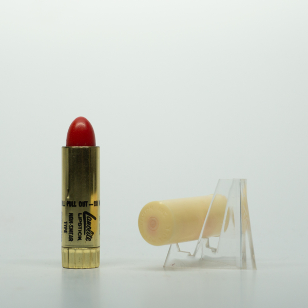 A brass, cylindrical lipstick tube with a tapered top. The lipstick can be opened by lifting the top from the base. The component is labeled, "Lanolite Lipstick / Blot or Don't Blot / Revlon, Inc. New York." A shade label on the bottom of the tube…