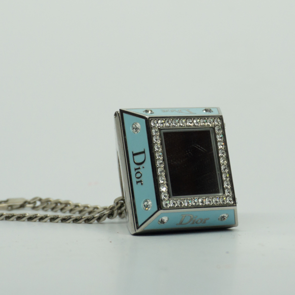 A silver over-sized princess ring with blue enamel trim surrounded by rhinestones featuring the designer's name, "Dior," On each side of the pyramid base. The flat top doubles as a mirror. Attached to the ring is a silver chain. Inside the ring areā¦
