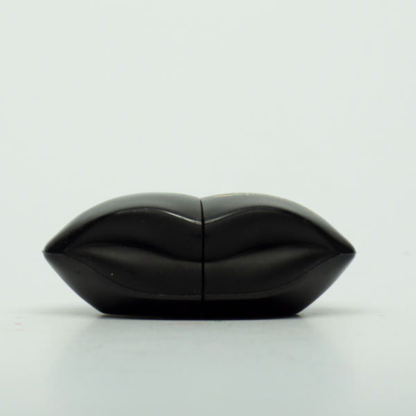 A black plastic lip-shaped lipstick tube. The top of the lipstick is stamped, "Salvador Dali." The lipstick can be accessed by removing the top and twisting the tube. The shade label reads, "Parfums Salvador Dali Paris Copyright Ray Int. / 02 / Rouge…