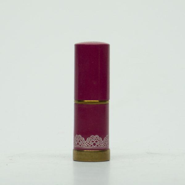 A brass lipstick tube with a pink enamel top and white floral accents. The lipstick can be accessed by removing the top and twisting the tube. The bottom of the tube is stamped with text reading, "Schiaparelli / Distributors New York."