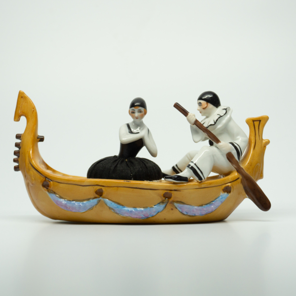 A feminine figure seated in a gondola being manned by a gondolier. A puff is disguised as the feminine figure's skirt. The feminine figure can be lifted out of the gondola and the seat can be used as a powder well.