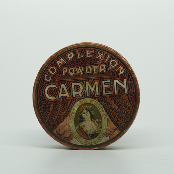 A round container printed in red, brown and green featuring a feminine figure in the brand stamp reading, "Stafford Miller Co. St. Louis, MO." Behind the stamp are red theatrical curtains behind text reading, "Complexion Powder / Carmen." A shade…