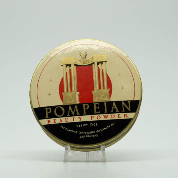 A circular container decorated with a gold, red and black graphic representing two columns in an arch surrounded by gold sparkles, below text reads, "Pompeian / Beauty Powder / Net Wt. 1/2 oz. / The Pompeian Corporation Baltimore, MD. Distributors."…