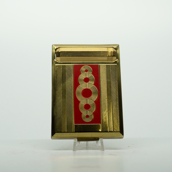 A rectangular compact with a geometric engraved motif featuring a red enamel accent below a pop-out lipstick tube. The compact also opens on a hinge with a finger clasp. Inside is a rectangular mirror, and two powder wells accompanied by two printed…