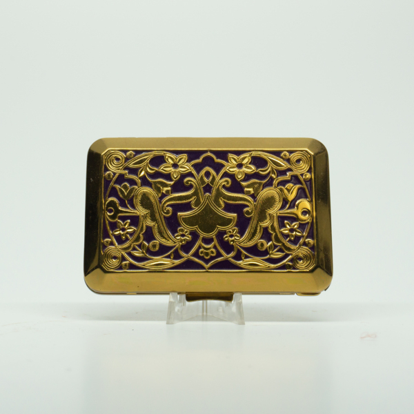 A rectangular rounded edge triple vanity brass compact. The top of the compact has a floral filigree with deep purple enamel in the recess. The compact opens on a hinge. Inside there is a powder, blush and lipstick.