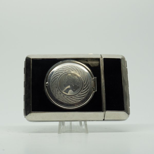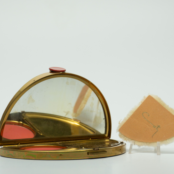 A half-circle brass Compact with three compartments. The central compartment is a lipstick with red, white and blue stripes. One either side of the lipstick are wings. Inside the compact are the other two features: a pressed powder and rouge. There…
