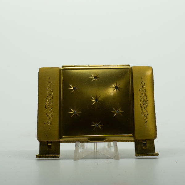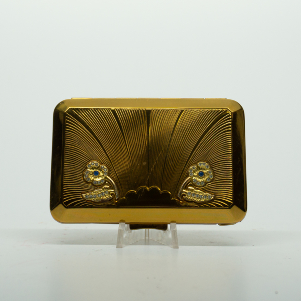 A rectangular brass triple compact with a floral motif on its lid featuring simulated diamonds and sapphires. The compact opens on a hinge with a finger clasp. Inside, there is a rectangular mirror, lipstick and two puffs printed, "Richard Hudnut."…