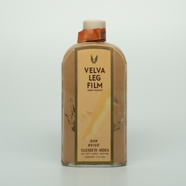 A rectangular glass bottle with a rounded top. The white screw top is wrapped in a fabric bow. On the front of the bottle, a label with gold graphics and black text reads, "Velva Leg Film / Sun Beige / Elizabeth Arden / 691 Fifth Avenue New York /…