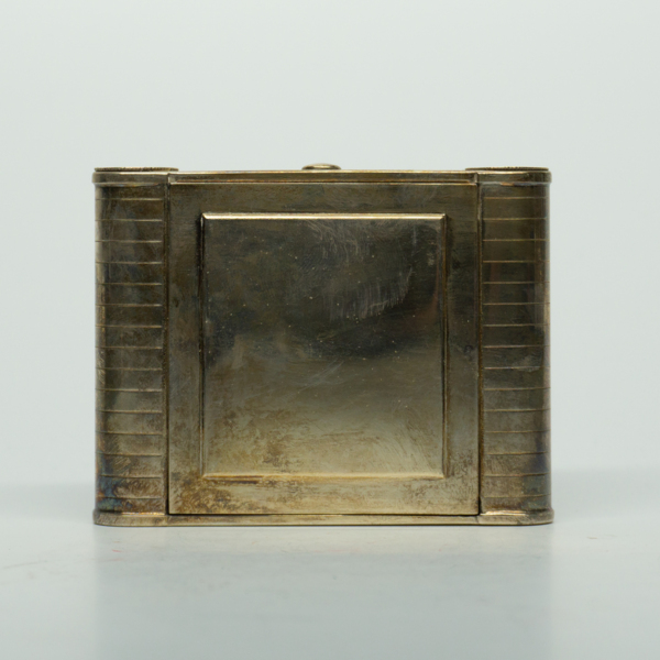 A rectangular compact with two tubes: one for a battery, and one for a lipstick. The Compact opens to reveal a mirror providing light from the battery power source. Opposite the mirror is a powder well and puff stamped, "Venus Ray."