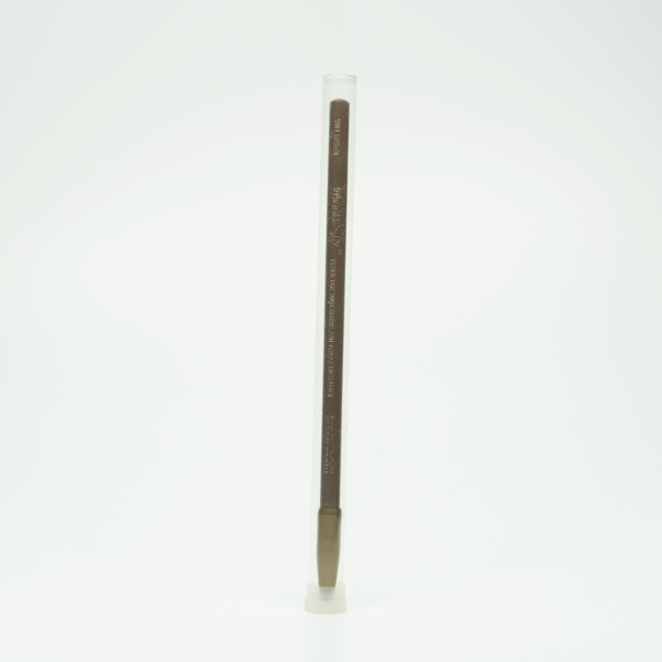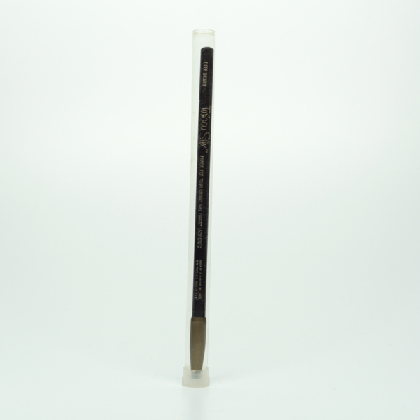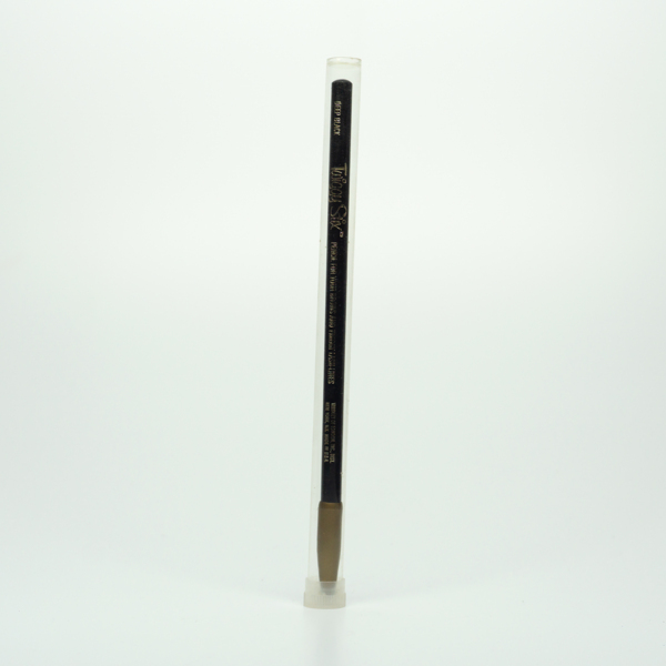An eyeliner pencil with a taupe wrap and gold plastic lid. The pencil is inside of a plastic tube. Text on the pencil reads, "Soft Brown / Twiggy Stix [trademark] / Pencil for your brows and Twiggy lash lines / Yardley of London, Inc. Dist. New York,…