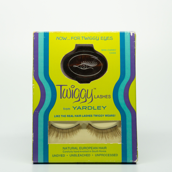 A green, blue and purple graphic container with plastic window to the product: both the set of false eyelashes and a carrying case. Text on the container reads, "Now...For Twiggy Eyes / Mini-Carry Case / Twiggy [trademark] Lashes from Yardley / Like…