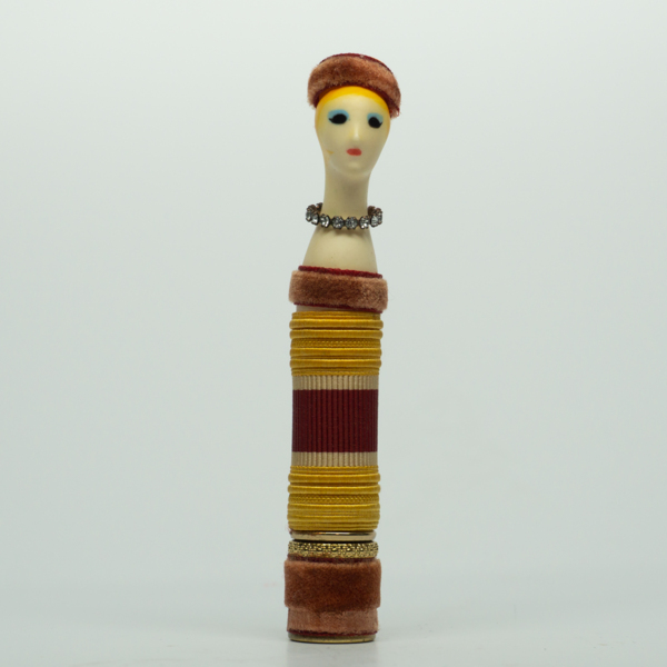 A doll-shaped container for lipstick, wrapped in striped ribbon and fur to resemble a dress, and a fur hat. The doll head is painted with red lips, pink eyeshadow, black eyelashes and red-brown hair. A circular label on the bottom of the doll reads,…