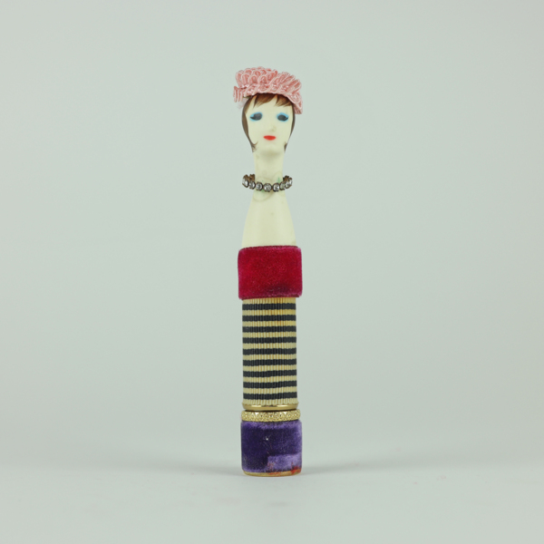 A doll-shaped container for lipstick, wrapped in light pink felt and striped ribbon to resemble a dress, and a string of rhinestones to resemble a diamond necklace. The doll head is painted with red lips, blue eyeshadow, black eyelashes and…