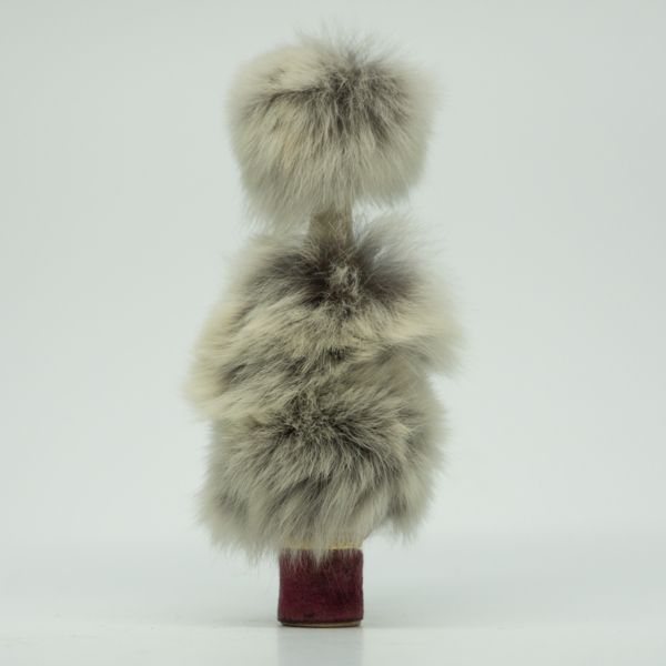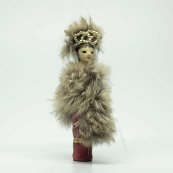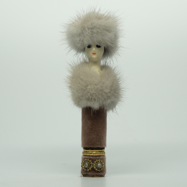 A doll-shaped container for lipstick, wrapped in light purple felt and fur to resemble a dress and a fur hat. The doll head is painted with red lips, blue eyeshadow, black eyelashes and black hair. A circular label on the bottom of the doll reads,…