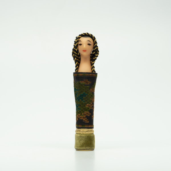 A doll-shaped container for lipstick, wrapped in green felt and floral ribbon to resemble a dress and a head dress in the style of Cleopatra. The doll head is painted with red-orange lips, brown eyeshadow and black eyelashes. A circular label on the…