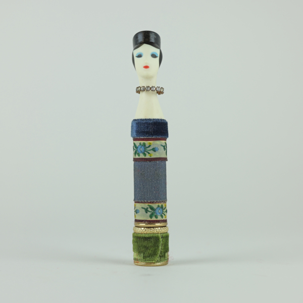 A doll-shaped container for lipstick, wrapped in light blue and green felt and floral ribbon to resemble a dress, and a string of rhinestones to resemble a diamond necklace. The doll head is painted with red lips, blue eyeshadow, black eyelashes and…