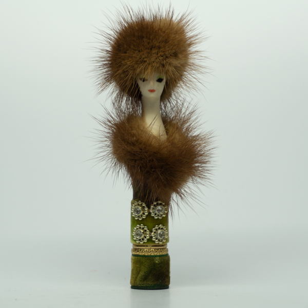 A doll-shaped container for lipstick, wrapped in green pink felt and fur to resemble a dress, rhinestones and a hat. The doll head is painted with red lips, green eyeshadow, black eyelashes and dark-brown hair. A circular label on the bottom of the…