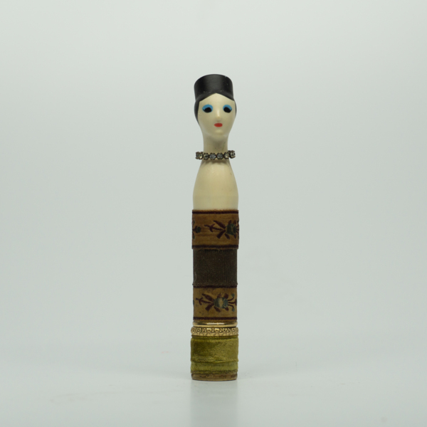 A doll-shaped container for lipstick, wrapped in green felt and floral ribbon to resemble a dress and a string of rhinestones to resemble a diamond necklace. The doll head is painted with red lips, blue eyeshadow, black eyelashes and black hair. A…