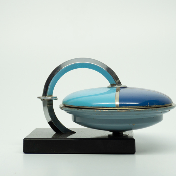 A sterling silver compact shaped like a combat helmet. The compact opens at a hinge with a small loop tab. Inside the compact is a puff and pressed powder.