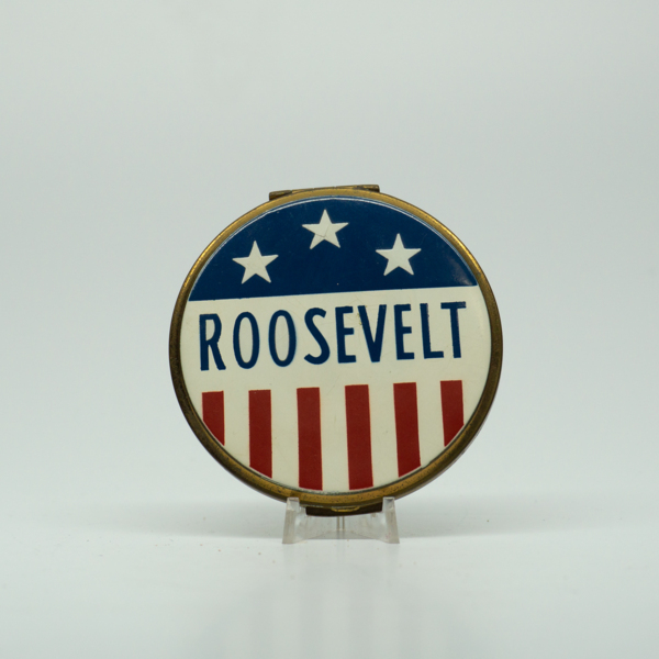 A round red, white and blue compact with, "Roosevelt," on the top. The compact opens on a hinge with a finger ridge. Inside there are two mirrors the full diameter of the compact and a puff with text reading, "Volupte."