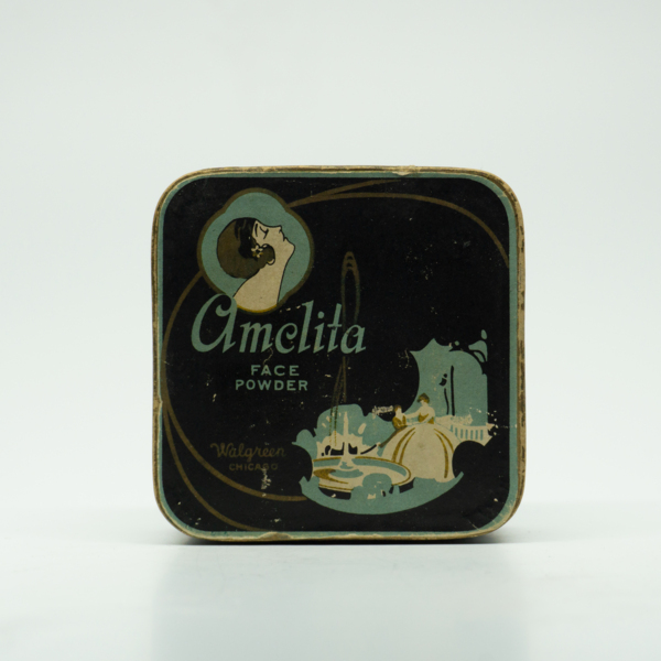 A rectangular cardboard container with blue, black, white and gold graphics featuring a garden picnic scene. The top is printed with text reading, "Amelita / Face Powder / Walgreen Chicago." The motif continues around the sides of the container. Even…