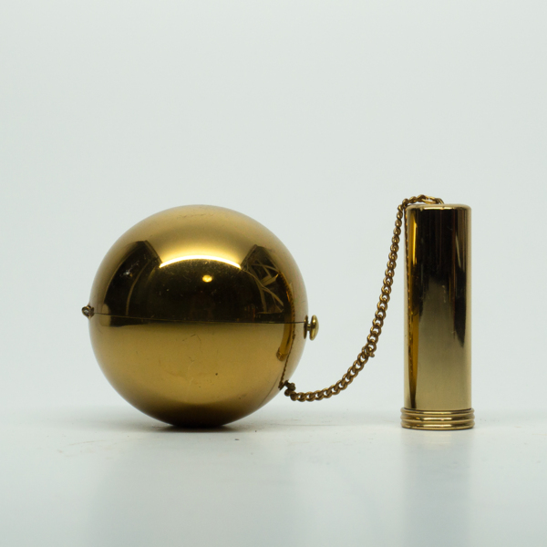 A brass spherical ball linked to a brass lipstick via a small brass chain. The structure of the set mimics its title, "Ball and Chain." Inside the compact is a mirror the full diameter of sphere, a powder well and a light pink puff.