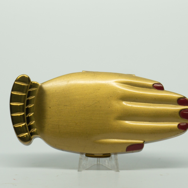 The red manicure golden gesture compact. The top of the compact features a red enamel coat on each fingernail. The compact opens on a hinge with a finger ridge. Inside is a powder well, mirror and puff.